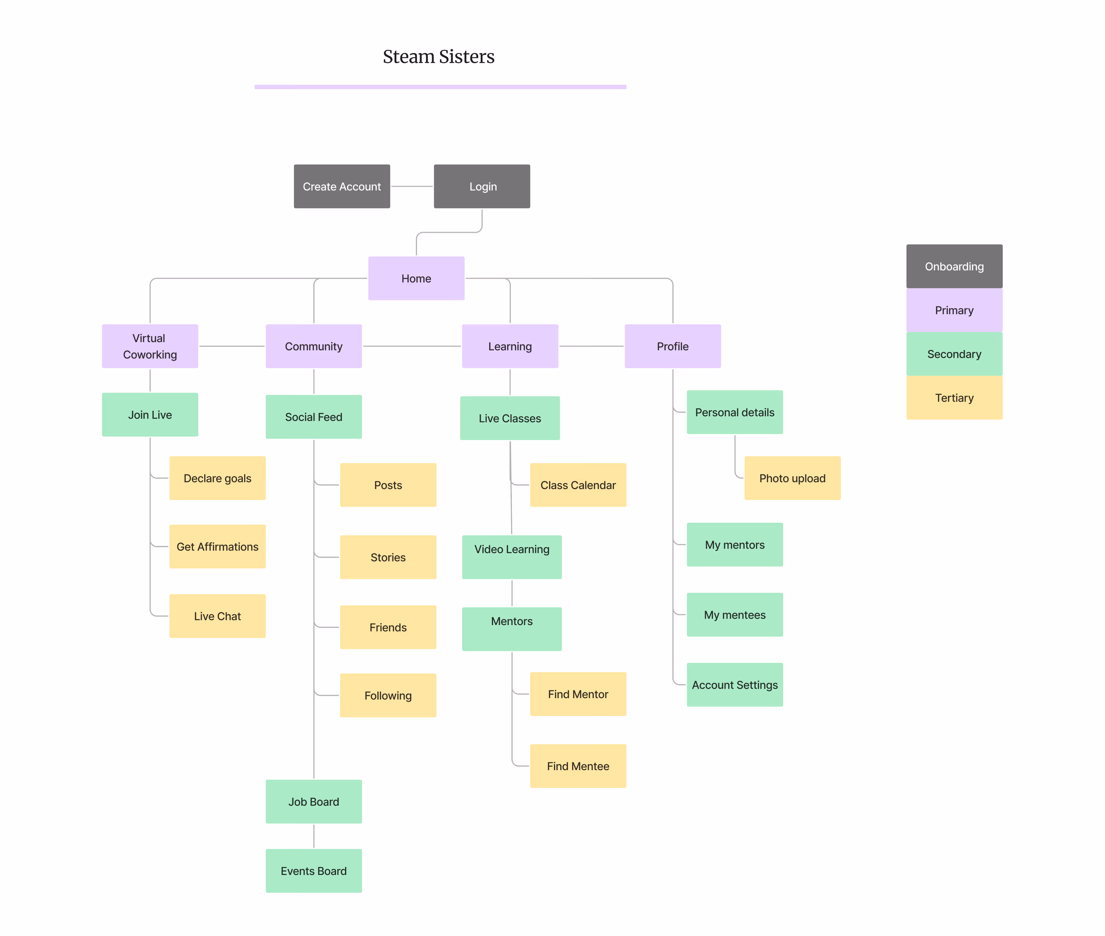 This visual and conceptual sitemap captures the holistic vision of Steam Sisters - a platform that integrates focused productivity, community support, lifelong learning, and meaningful mentorship. By mapping out the structure this way, it becomes easier to identify both user flows and technical needs as the project progresses.